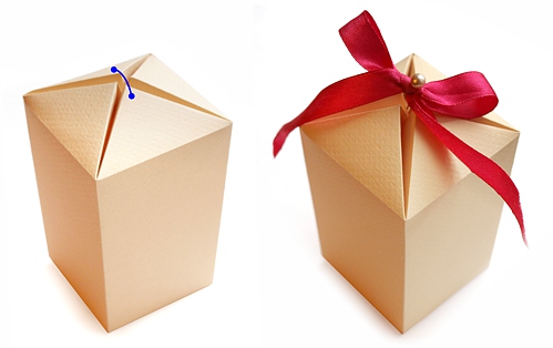 5. Złóż wieczko zgodnie z liniami zagięć. Na wierzchu przyklej kokardkę. Najlepiej przykleić ją w dwóch miejscach, tak żeby łączyła dwa przeciwległe trójkąty.