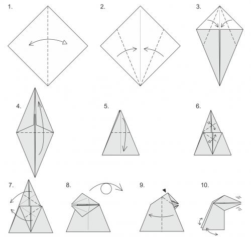 1. Z kwadratowej kartki wykonaj model głowy żurawia zgodnie z poniższą instrukcją.