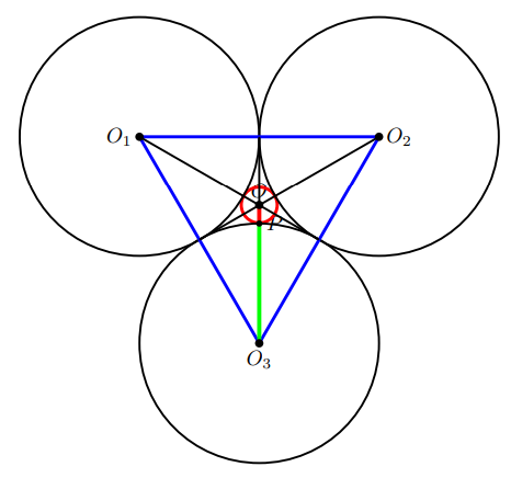 Zad. 2. Dane są trzy jednakowe okręgi parami styczne zewnętrznie. Pomiędzy nimi znajduje się mniejszy okręg styczny zewnętrznie do każdego z nich. Jaki jest stosunek promienia małego okręgu do promienia okręgów większych?